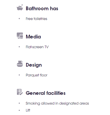 ที่พักนี้มีลานระเบียงและระเบียง และมีเครื่องปรับอากาศ โทรทัศน์พร้อมช่องสัญญาณดาวเทียมเพื่อให้การเข้าพักของแขกสนุกยิ่งขึ้น สิ่งอำนวยความปลอดภัยในห้องประกอบด้วยเครื่องตรวจจับควันและกุญแจอิเล็กทรอนิกส์ เพื่อความสะดวกสบายของคุณจะพบห้องสุขาแยกต่างหาก อ่างอาบน้ำและฝักบัว เครื่องเป่าผม ของใช้ในห้องน้ำ และผ้าขนหนู